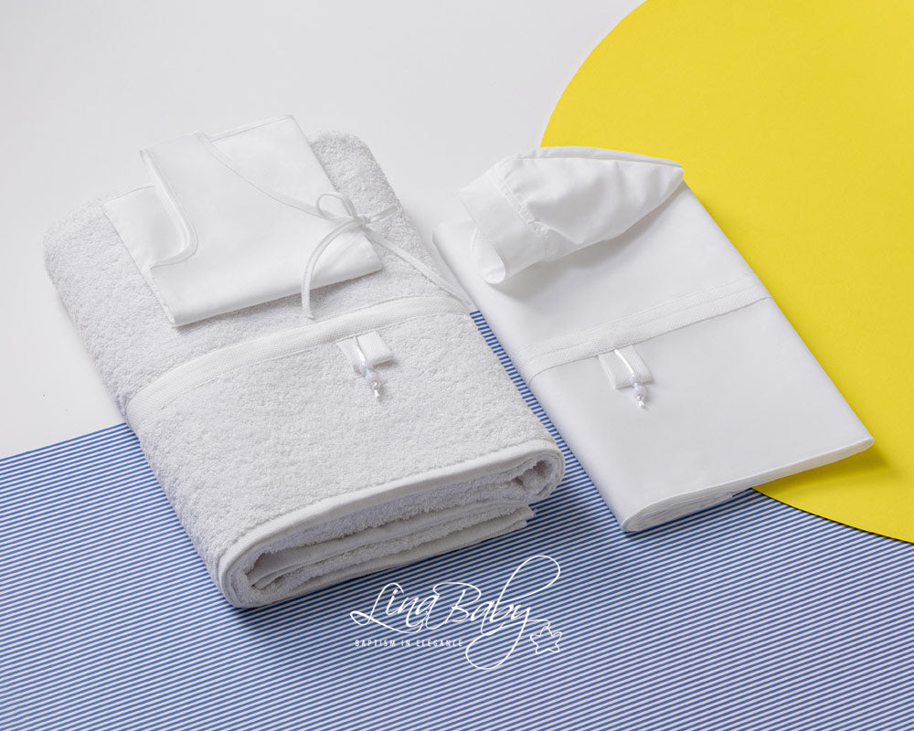Schlichtes und elegantes Baumwollset Wachstuch in weißer Farbe mit Piqué-Tresse und dekorativen Perlen in den Farben Weiß und Siel. Handtuch 70*140*400gr2. Vaterhandtuch 30*50*400gr2. Alle Lina Baby-Handtücher tragen das STANDARD 100 by OEKO-TEX®-Label (das bedeutet, dass die Produkte keine schädlichen Mengen an Chemikalien enthalten).