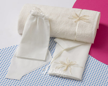 Βαμβακερό σετ  λαδόπανου σε δύο χρώματα λευκό και ιβουάρ με μίνιμαλ διακόσμηση από σατέν κορδέλα και φιογκάκι δαντέλας. Πετσέτα 70*140*400gr2. Πετσέτα παπά 30*50*400gr2. Ολες οι πετσέτες της Lina Baby φέρουν την ετικέτα STANDARD 100 by OEKO-TEX® (Αυτό σημαίνει ότι τα προϊόντα δεν περιέχουν επιβλαβή επίπεδα χημικών ουσιών).