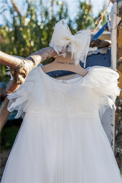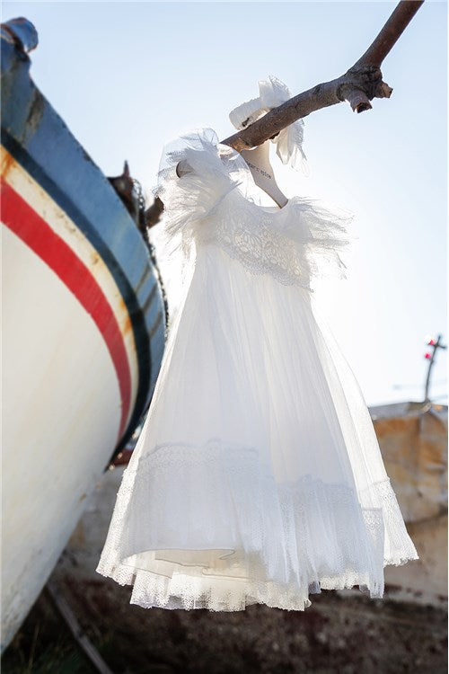 Ιδιαίτερο φόρεμα από Γαλλικό τούλι και βαμβακερή δαντέλα. Η ιδιαίτερη και πολύτιμη δαντέλα κοσμεί το μπούστο, τα μανίκια και το τελείωμα της φούστας. Η φούστα και τα μανίκια του φορέματος είναι φτιαγμένα από πολλές σειρές Γαλλικό μαλακό τούλι.