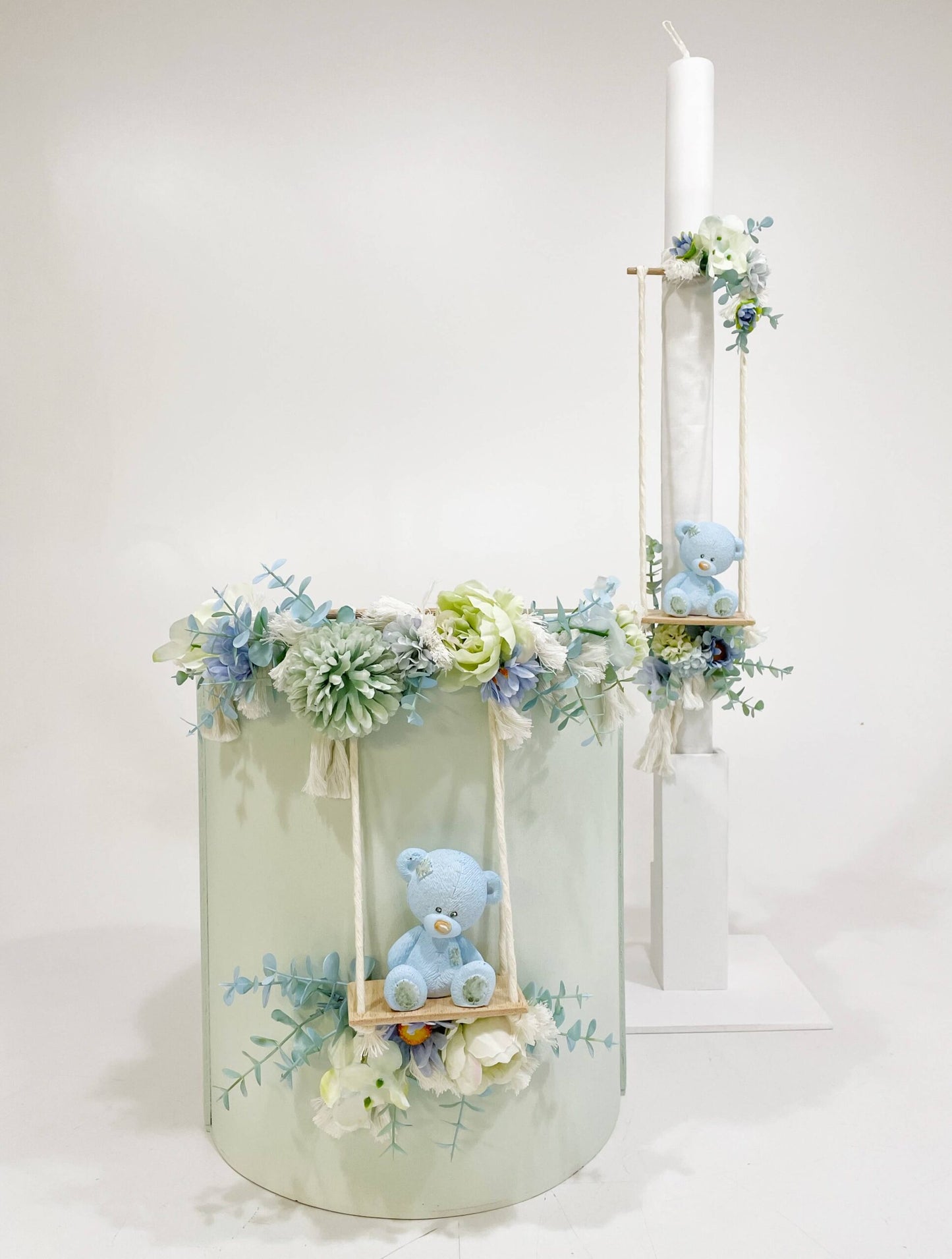 Ξύλινο καλάθι με στολισμό by Elena Manakou, ασορτί λαμπάδα με στολισμό by Elena Manakou και λαδοσέτ.