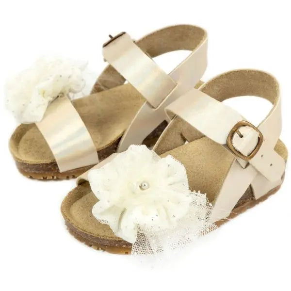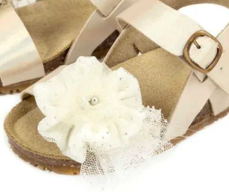 Δερμάτινο Πέδιλο με Υφασμάτινο Λουλούδι σε Nude-Εκρού χρώμα.