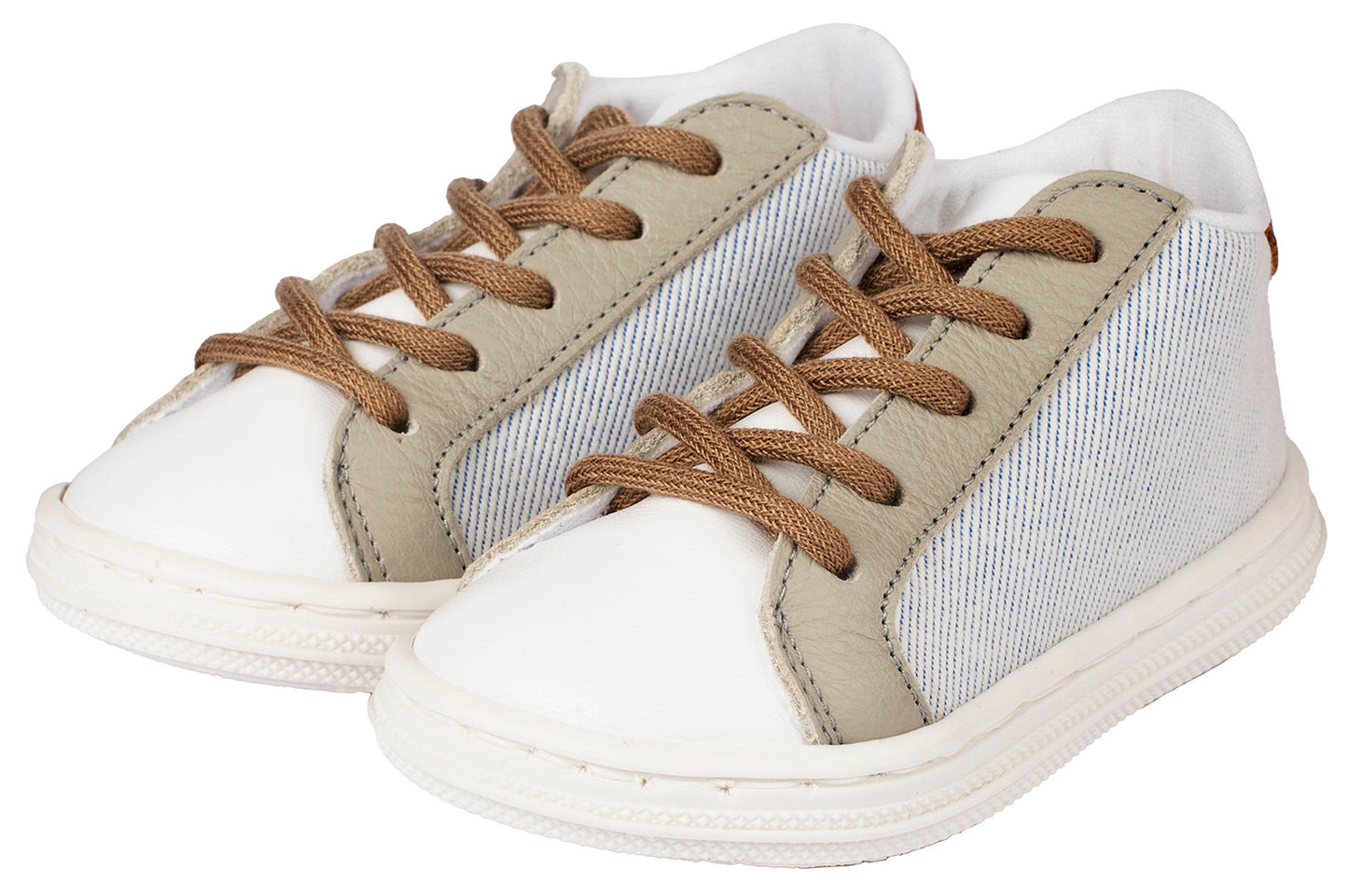 Δετό σνίκερ με συνθετικό δέρμα και ύφασμα σε μπεζ-λευκό-μπλε, λευκό-γκρι-ταμπά και μέντα-λευκό-μπεζ χρώμα.