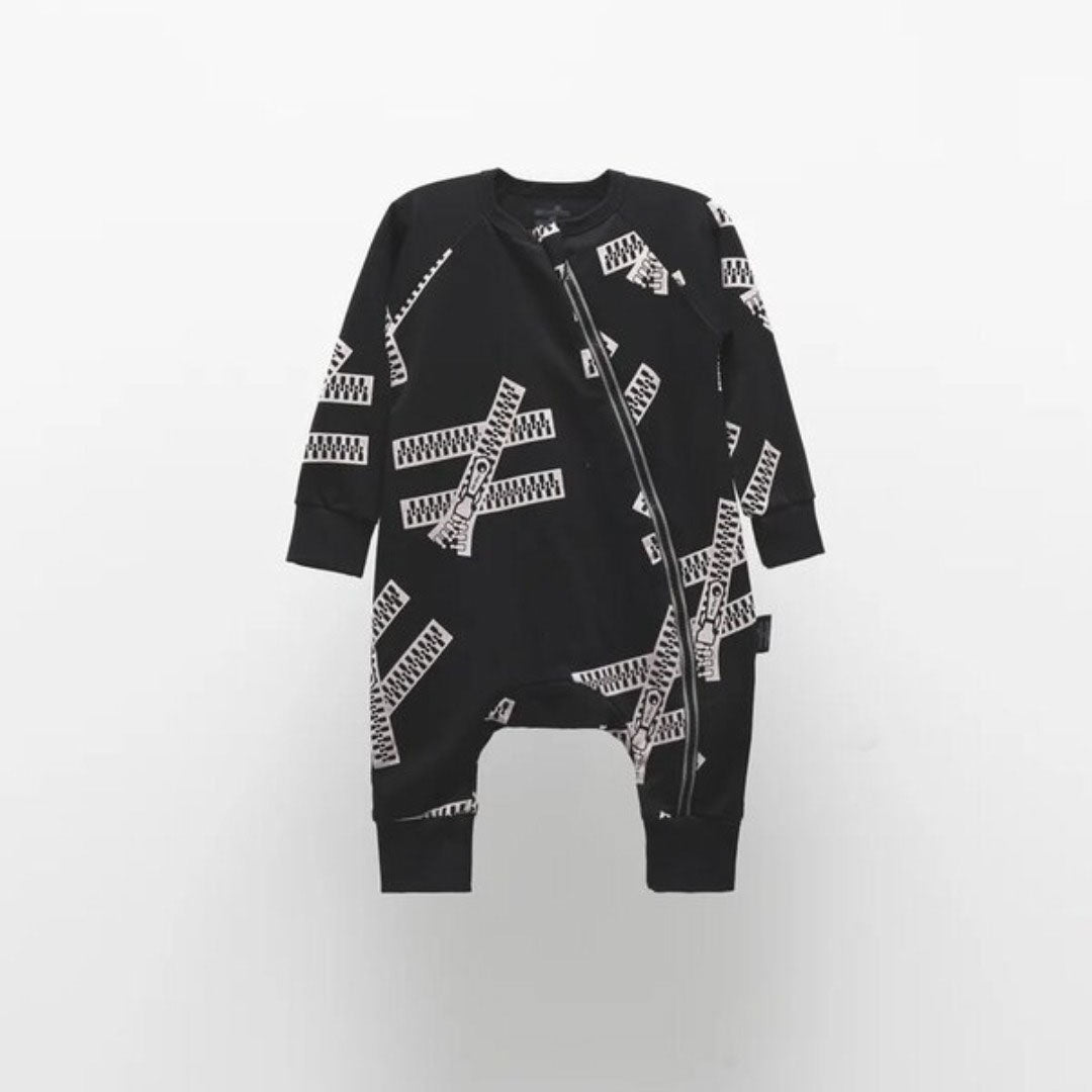Βρεφική ολόσωμη φόρμα σε μαύρο χρώμα με υπέροχο τύπωμα φερμουάρ της αγαπημένης μας εταιρείας MOI NOI. Η φόρμα κλείνει με λοξό φερμουάρ κατά μήκος της ενώ στα τελειώματα έχει λάστιχο. Ένα ιδιαίτερο σχέδιο για μοντέρνες εμφανίσεις των μικρών σας που ξεχωρίζουν!