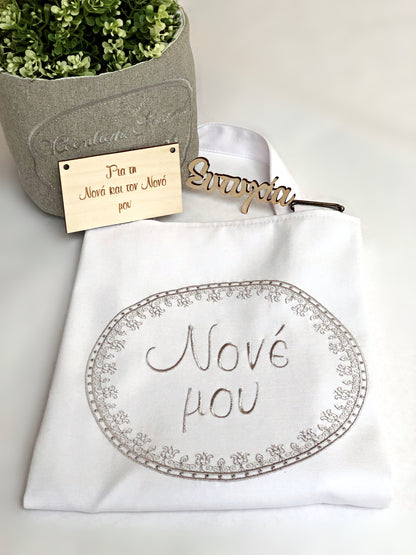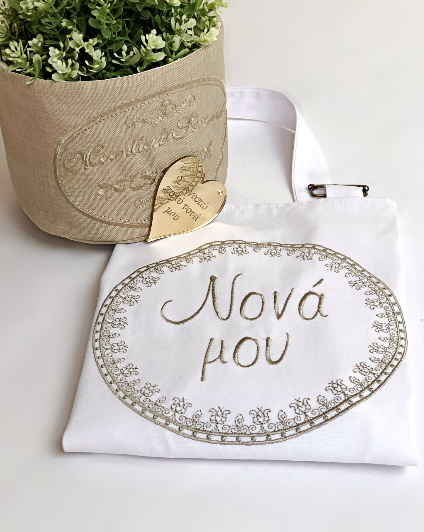 Υφασμάτινη ποδιά βάπτισης νονάς-νονού σε λευκό χρώμα με κέντημα σε γκρι χρώμα.