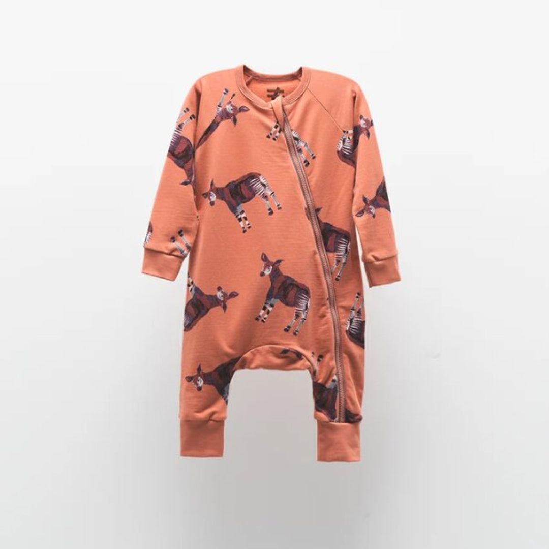 Βρεφική ολόσωμη φόρμα σε κεραμιδί χρώμα με υπέροχο τύπωμα ζωάκια της αγαπημένης μας εταιρείας MOI NOI. Η φόρμα κλείνει με λοξό φερμουάρ κατά μήκος της ενώ στα τελειώματα έχει λάστιχο. Ένα ιδιαίτερο σχέδιο για μοντέρνες εμφανίσεις των μικρών σας που ξεχωρίζουν!